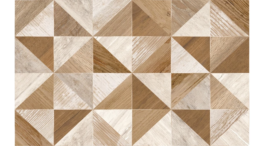 A Cersanit Reina Modern 25×40 fali csempe egyedi, háromszöges mozaikmintázatával friss, kortárs megjelenést kölcsönöz a belső tereknek. A különböző famintázatok, színek és árnyalatok harmonikus kombinációja izgalmas vizuális játékot teremt, miközben megőrzi a fa természetes melegségét és otthonos hangulatát. A matt felület visszafogott eleganciát biztosít, így a burkolat nem válik túlzottan dominánssá.