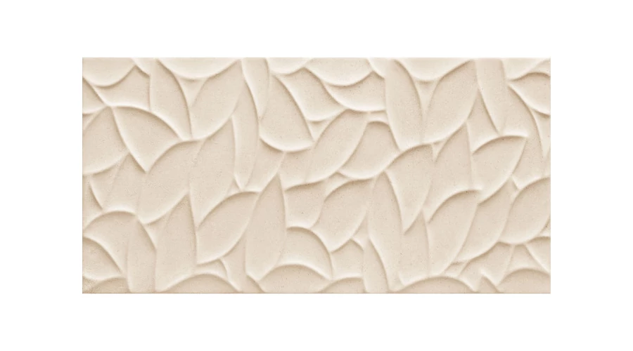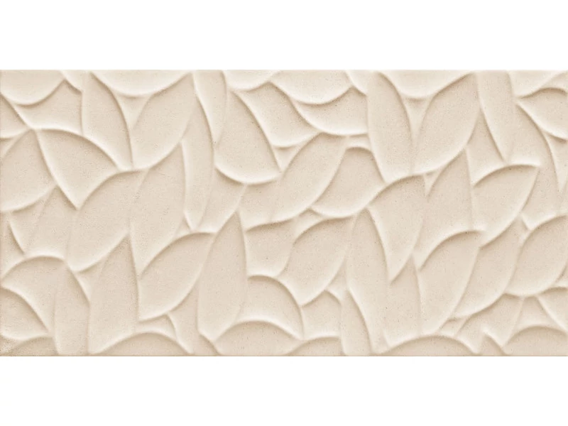 A Domino Tempre Beige Struktura falicsempe elegáns és különleges megjelenésű burkolat, amely finom, vékony domborvonalas, levélmintára emlékeztető struktúrájával exkluzív hangulatot teremt fürdőszobájában vagy konyhájában. A fényes felület elegáns csillogást kölcsönöz a térnek, míg a lágy bézs árnyalat harmonikus, meleg és természetes hatást biztosít.